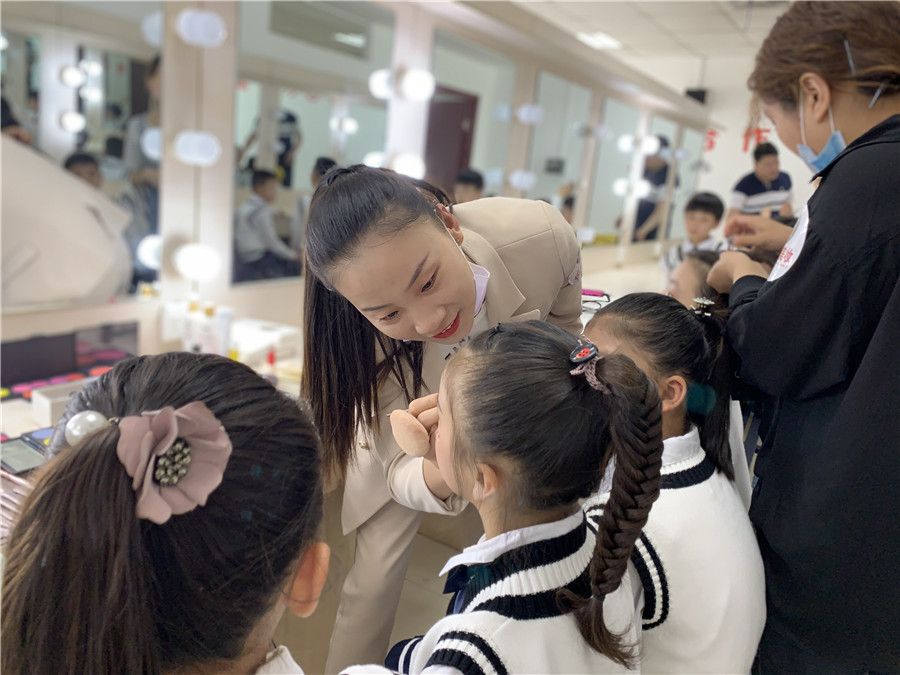 青岛悦风美妆学院化妆班学员为参加“童星梦想秀”的小演员们化妆造型