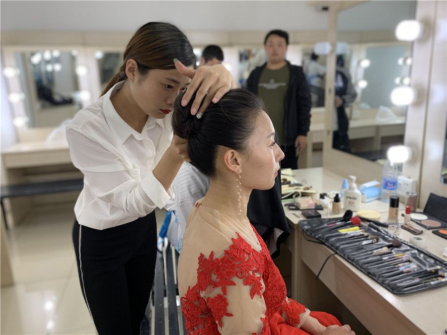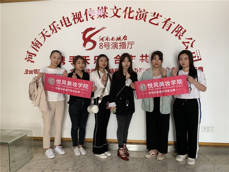 青岛悦风美妆学院学员在广播电视台8号演播厅。